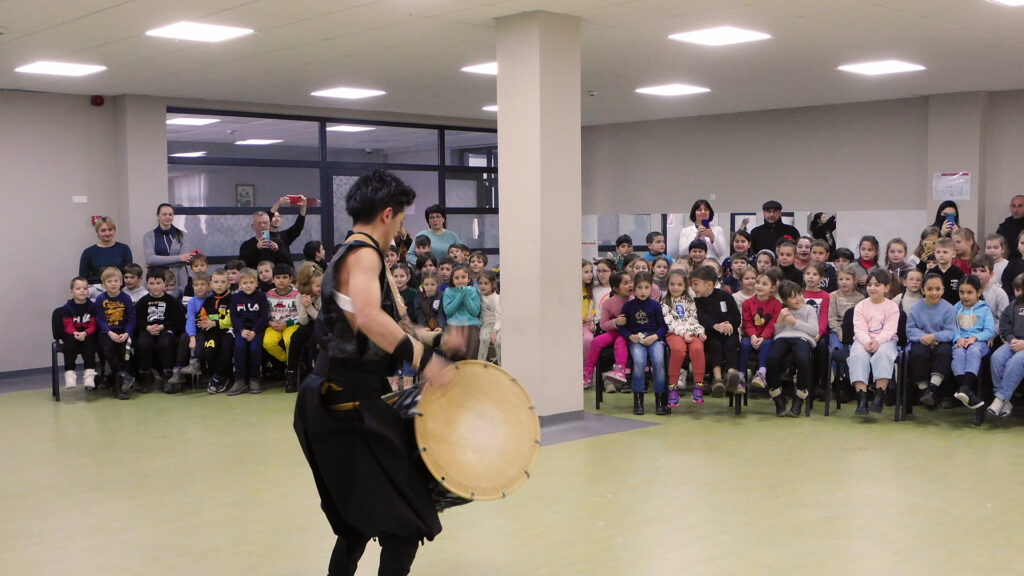体育館いっぱいに広がる和太鼓の響き。体の奥まで届く低音が、空間全体を包み込みます。強弱や静と動のメリハリを丁寧に組み立てることで、自然と引き込まれる時間をつくります。
